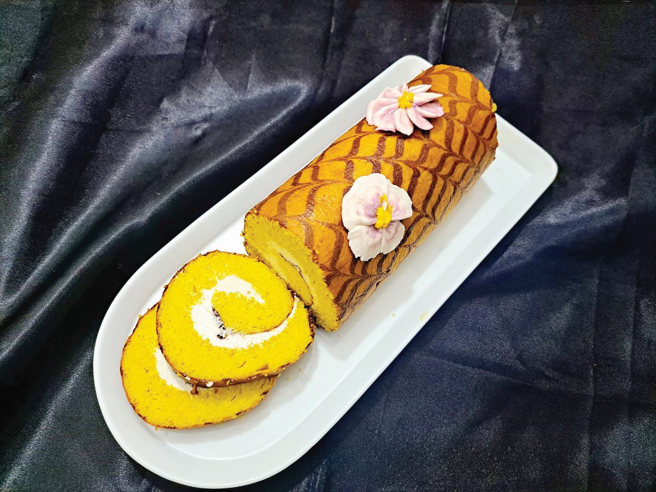 এবার একটি বাটার পেপার বিছিয়ে নিন। কেক খুব সাবধানে টিনসহ সেই পেপারের ওপরে উল্টো করুন। এতে কেকের বাদামি অংশটা বিছিয়ে রাখা কাগজের ওপরে পড়বে এবং নিচের অংশটা ওপরে। এবার রোল করে নিয়ে ফ্রিজে রাখুন। এরপর টিনে বিছিয়ে দেওয়া যে কাগজ সেটা উঠিয়ে ফেলুন। এবার আস্তে আস্তে কেকটা রোল করা শুরু করুন। কাগজসহ একটু রোল করুন, ফ্রিজে রাখুন এক ঘণ্টার জন্য। এবার রোল খুলে পুরো কেকে ক্রিম লাগিয়ে নিন। কাগজ সরিয়ে আবার রোল করুন। এভাবে পুরো কেকটা রোল করে নিন। ফ্রিজে দুই ঘণ্টা রেখে কেটে পরিবেশন করুন।